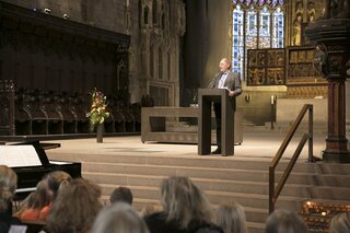 Heute feiern wir deinen Abschied als Reinoldikantor! Du hast mich - und wohl auch die meisten Menschen, die hier heute versammelt sind, damit überrascht, dass du nach Lübeck gehst. Ich habe mir Gedanken gemacht über die Zeit, den richtigen Zeitpunkt und über die Musik. Als du dich vor knapp 14 Jahren hier vorgestellt hast, hast du mich begeistert. Und du hast mich immer wieder begeistert! Mit deiner einnehmenden und überzeugenden, bisweilen überwältigenden musikalischen Gabe, mit deiner großen Gabe mit Menschen umzugehen, mit deiner Improvisationsgabe auf allen Ebenen. Und mit deiner Gabe mit Musik mich und viele Menschen zum Lächeln zu bringen. Nun gehst du als Domkantor nach Lübeck - und nur für uns hier scheint es wie ein unpassender Zeitpunkt. Durch deine Überzeugung, dass es der richtige Schritt ist, hast du uns an den Gedanken gewöhnt, dass es auch für uns der richtige Zeitpunkt ist. Ich danke dir für lange Jahre des gemeinsam unterwegs-Seins, für unser gemeinsames Musizieren und an-einem-Strang-ziehen, für deine Offenheit und Ehrlichkeit und für unser Miteinander! Ich danke dir hier auch und in besonderer Weise im Namen der Kolleginnen und Kollegen, der Kirchenmusikerinnen und Kirchenmusiker im Ev. Kirchenkreis Dortmund. Wir werden dich vermissen! Du hast uns viele Impulse gegeben, uns inspiriert, und du bist oft schon ein paar Schritte weiter gewesen. Du hast dich nie gescheut Aufgaben zu übernehmen! Und oft hast du dann auch noch für uns "mal eben" umgeräumt und aufgeräumt hier in der Kirche! Mit allen hier danke ich dir für die Musik, die die uns geschenkt und mit uns geteilt hast! Ich wünsche dir von Herzen alles Gute und Gottes Segen für dein Leben und Musizieren in Lübeck!